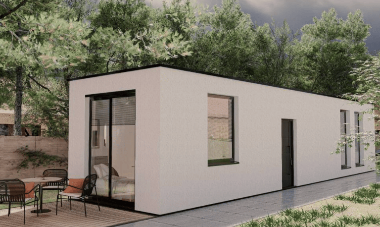 Compacte prefab woning met 2 slaapkamers, open keuken, ruime woonkamer, moderne badkamer en aparte technische ruimte. Verkrijgbaar in hout, steen of pleisterwerk.